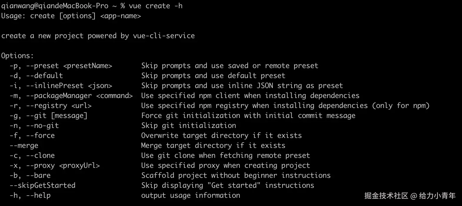 输入下面的命令就可以看到 vue create 支持的所有 options: