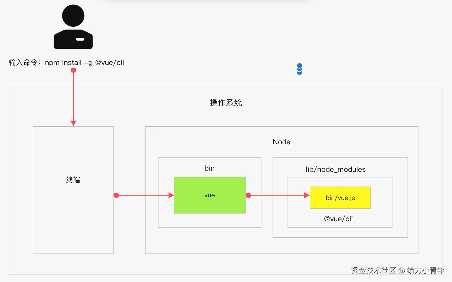 - 终端在环境变量中找到 vue 命令,根据 vue 命令指向的软链接找到实际文件 vue.js