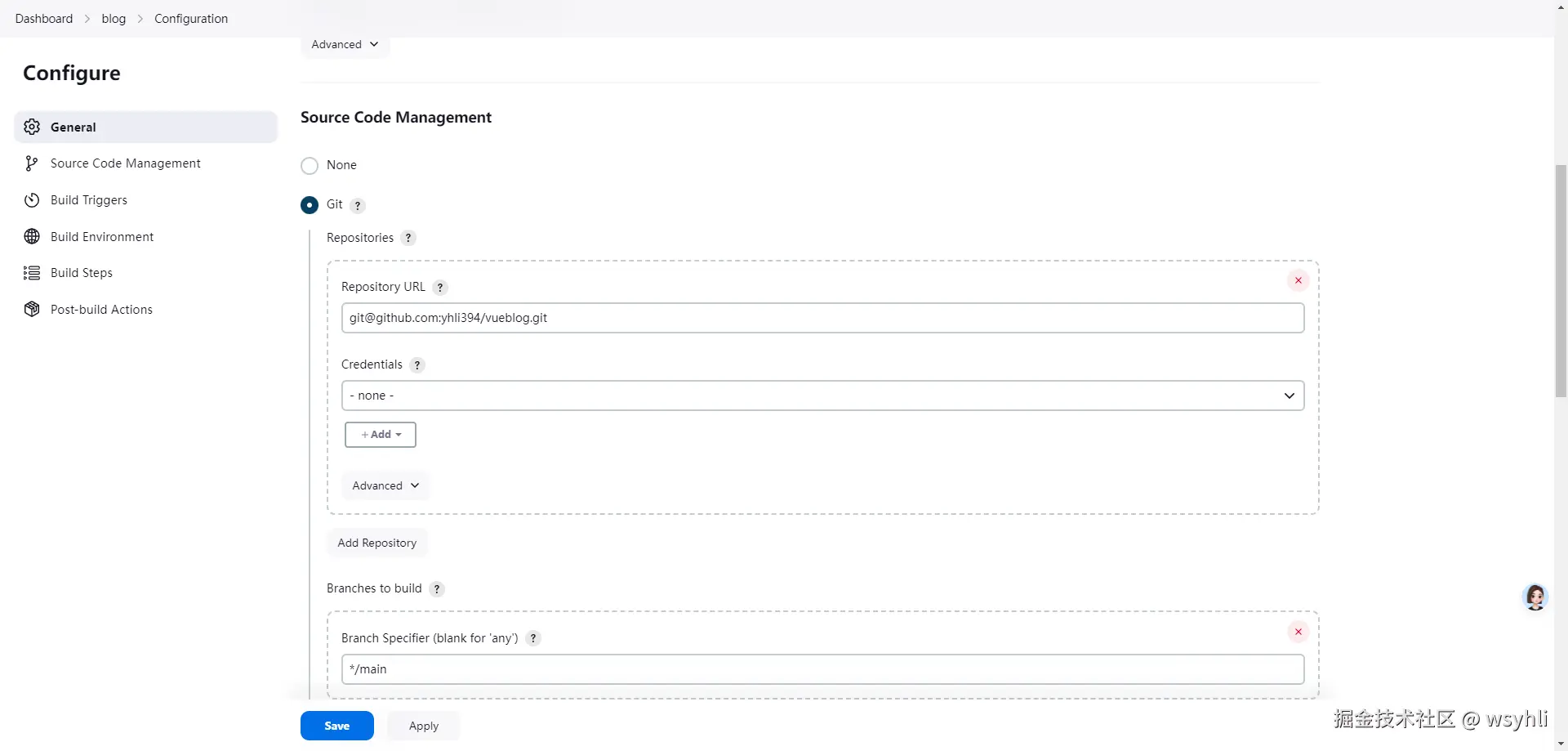 - Source Code Management中选择git并配置Repository URL,例如