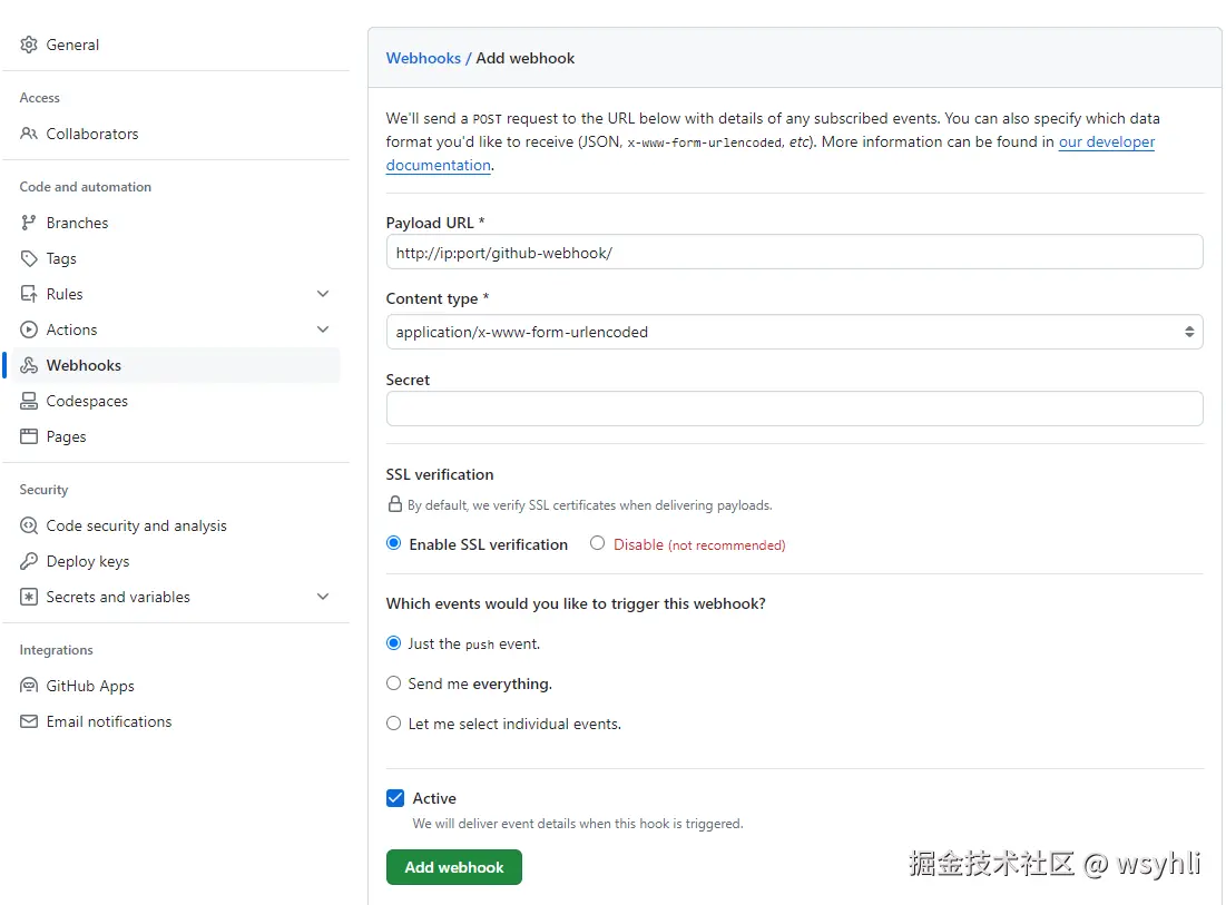 http://ip:port/github-webhook/,将ip和port替换为您的实际 IP 地址和端口号。 - 对于 Which events would you like to trigger this webhook? 选择 Just the push event 作为触发条件。
