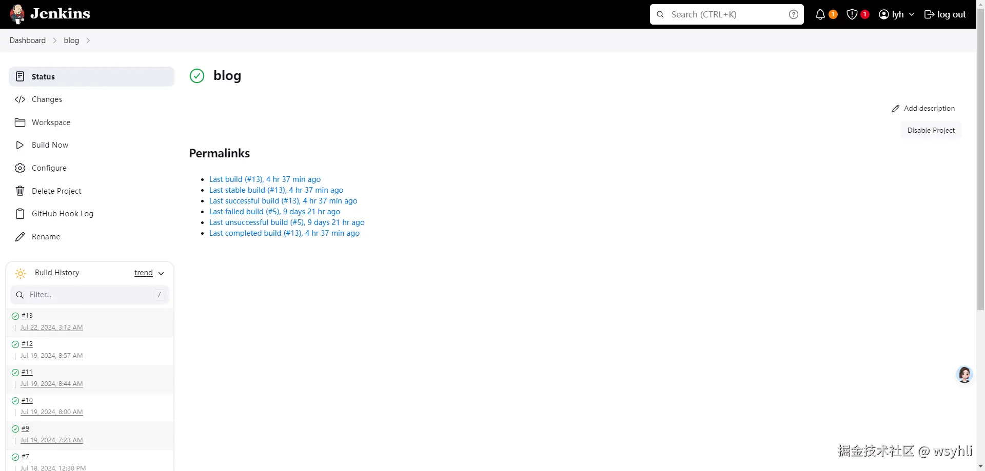 JenKins页面启动blog项目构建,点击Build Now。