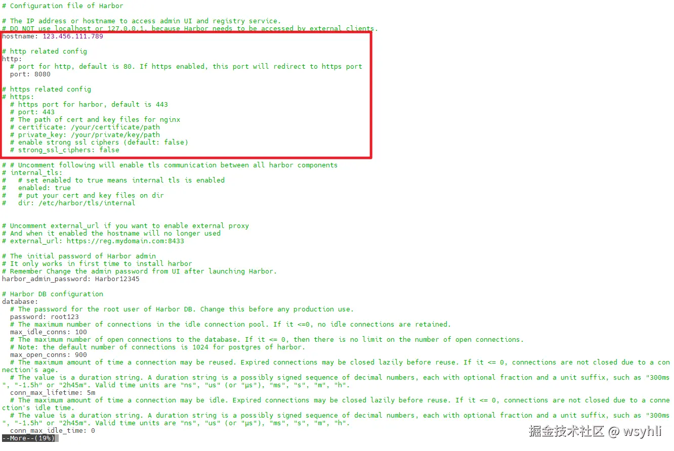 输入sudo vi harbor.yml指令修改harbor.yml文件内容,只需要改以下红框中的内容,其他配置默认就行。