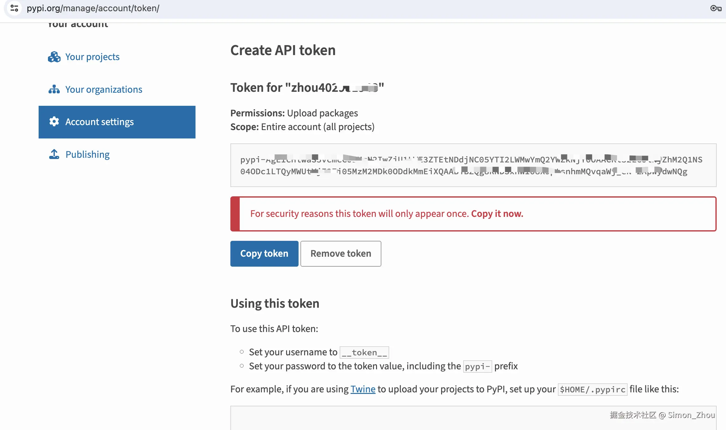 password = <the token value, including the `pypi-` prefix>