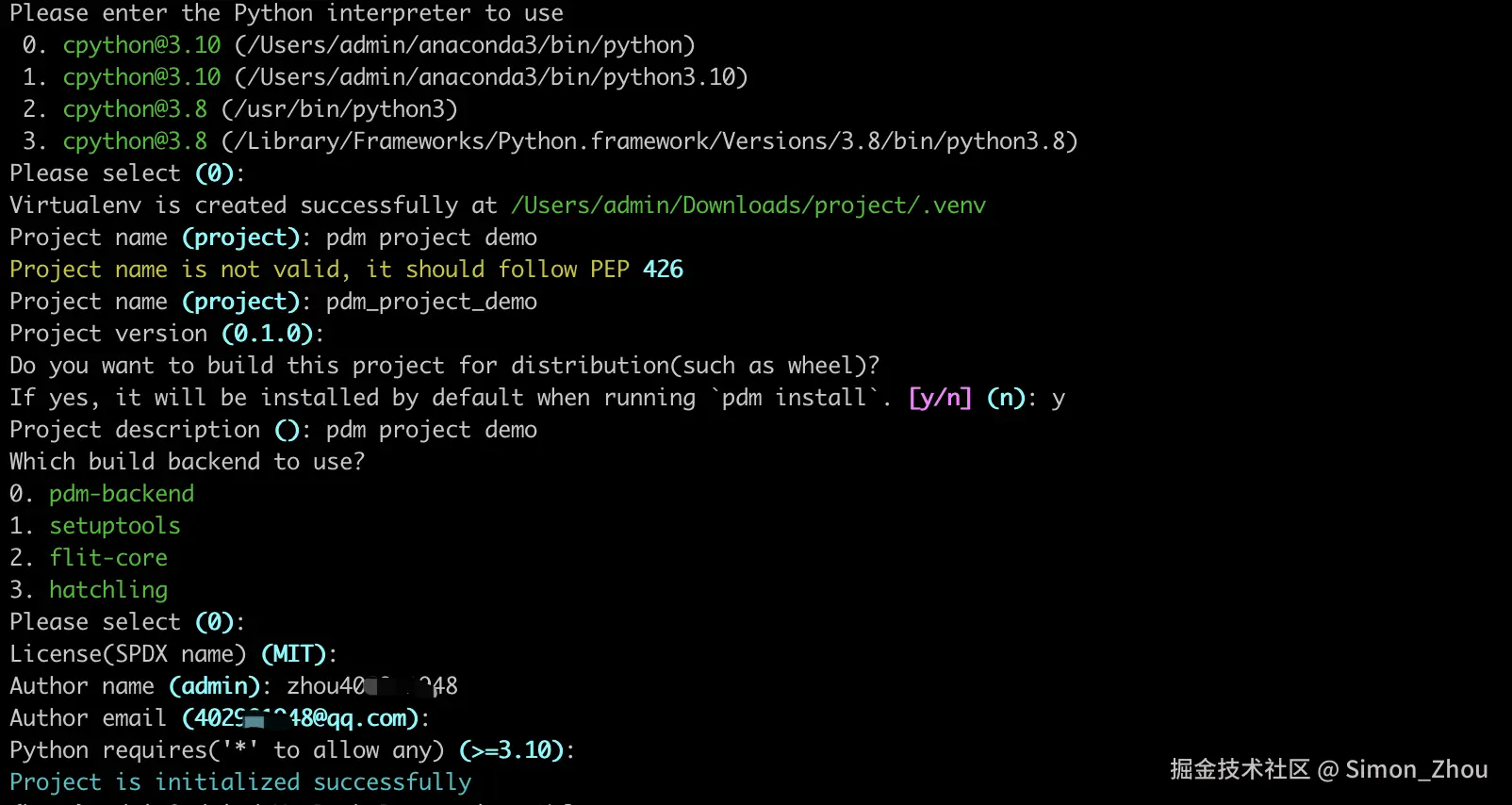 执行该命令会有一系列选项供选择,按实际填写就好。执行成功后项目里会包含pyproject.toml项目管理文件,src源代码目录,测试tests目录,README.md项目说明文件,还有.venv虚拟环境。