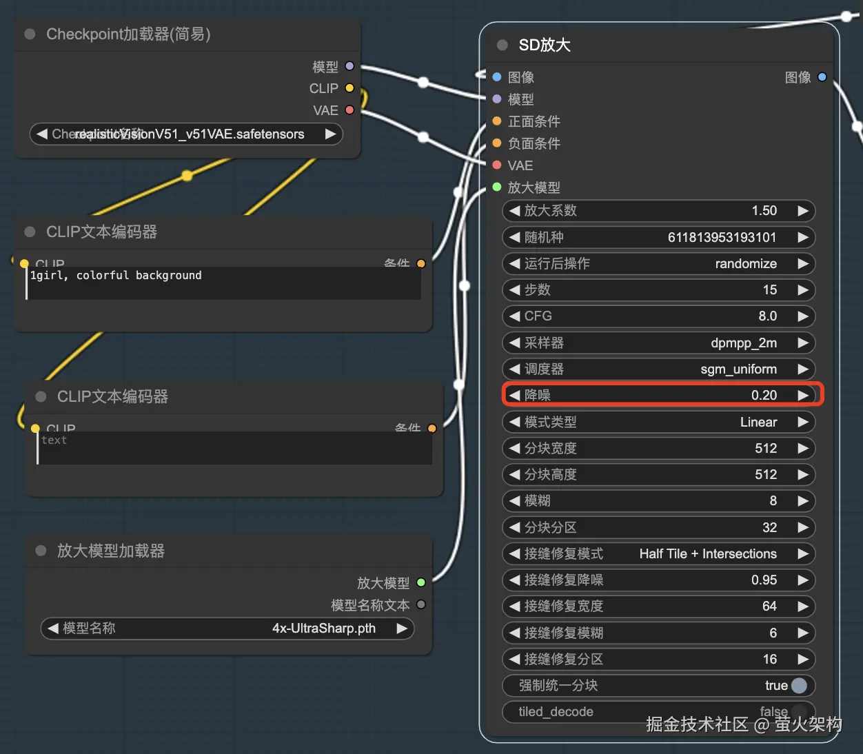 比如这里使用了“SD放大”节点,使用较低的降噪幅度,来让图片拼接的更为和谐,同时也不对图片中的元素进行大的改动。