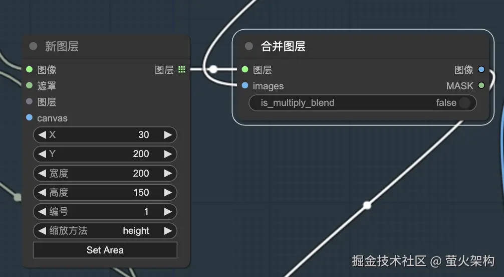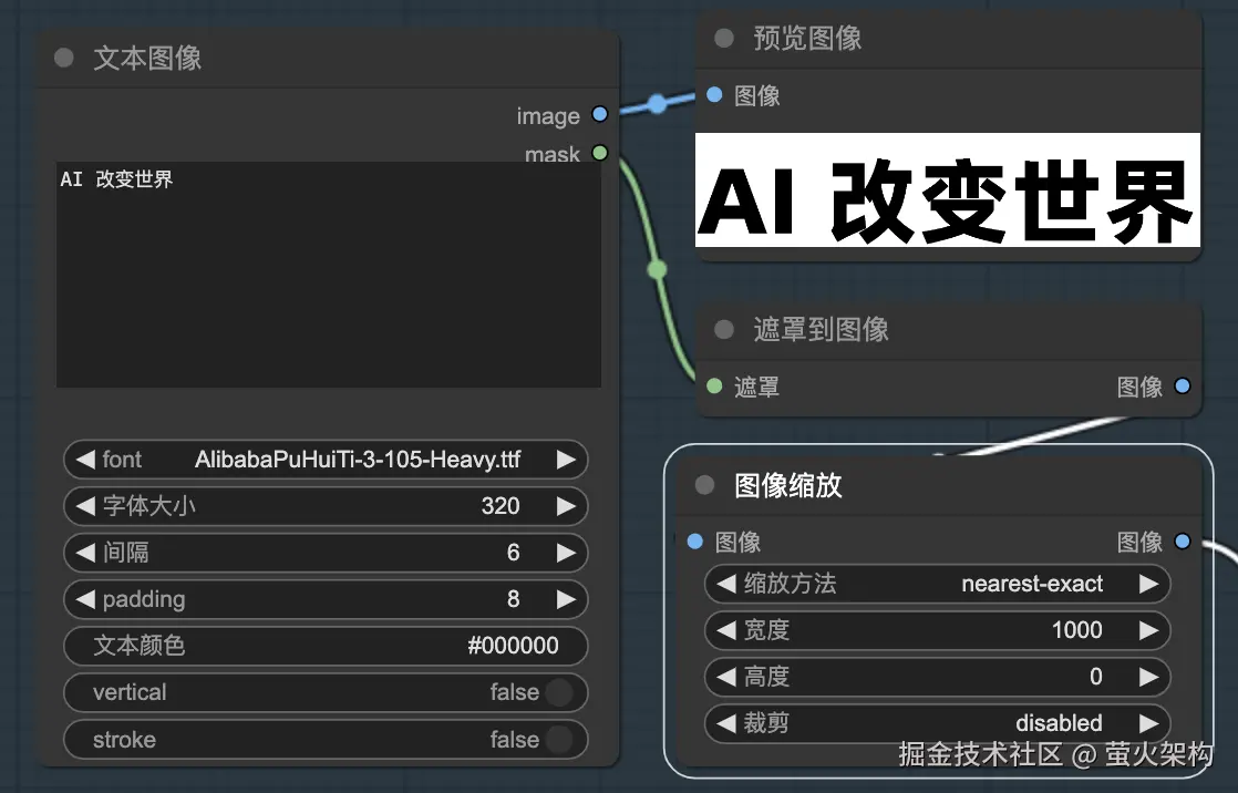 这里还用到了“遮罩到图像”,这是用来反转文字颜色的,用白色来显示文字,并将文字图片的背景设置为透明,方便合成到图片中;“图像缩放”节点用来控制文字图片的大小,需要搭配合成图片,大家按照自己的需要设置即可。