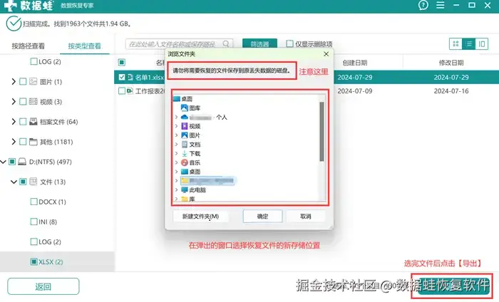 第4步: 选好文件后,点击【导出】,在选择还原文件的存储点即可完成回收站恢复。