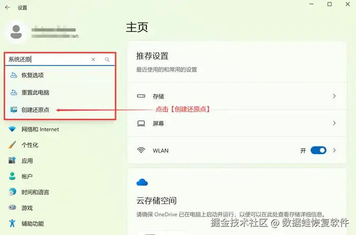 第1步: 进入电脑【设置】,可以直接在设置的搜索框内输入【系统还原】,点击下方的【创建还原点】,就会弹出【系统保护界面】。
