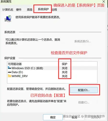 第3步: 点击【配置】按钮,设置误删之前的还原点,把电脑还原到清空之前的数据状态,从而找回因清空回收站而丢失文件或数据。