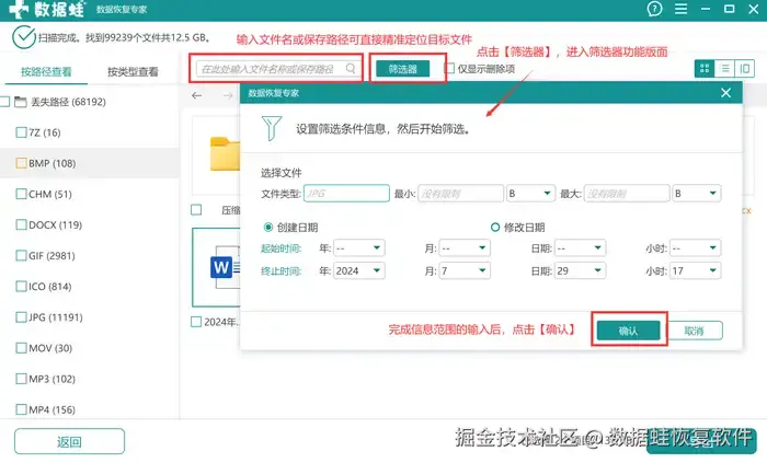 第3步: 出现扫描结果后,可以选择使用搜索框去直接定位目标文件,不确定具体信息的话,也可以通过【筛选器】功能去根据创建或误删时间排查目标文件。