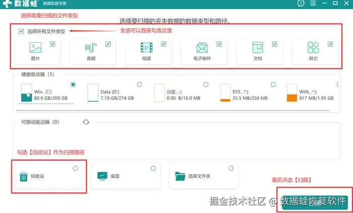 第2步: 进入扫描选择页面,需要选择扫描的文件类型(建议全部勾选)和单击勾选【回收站】。选择完毕后,点击【扫描】。