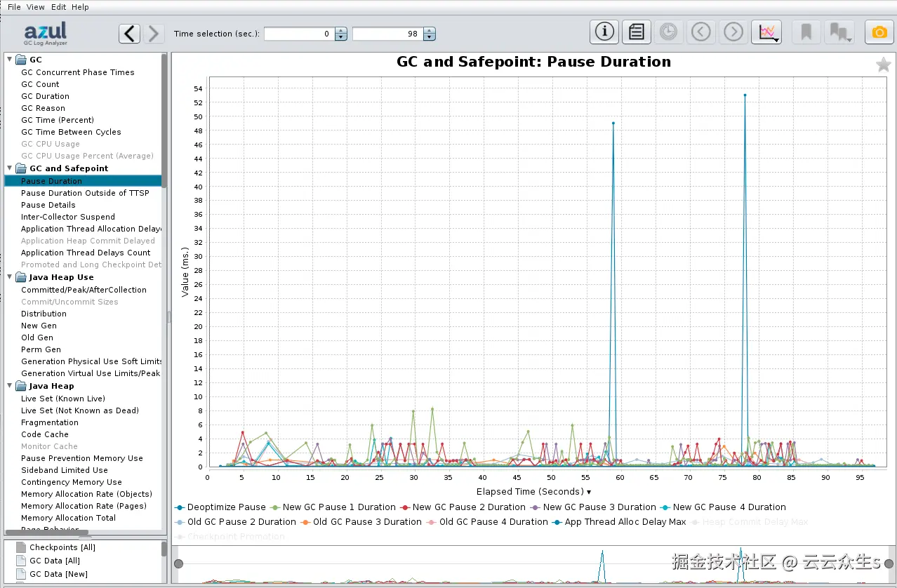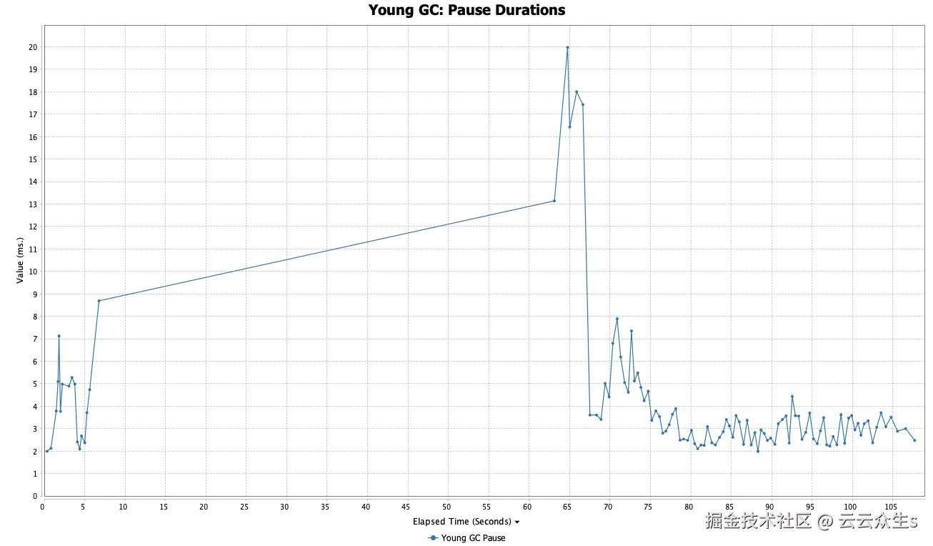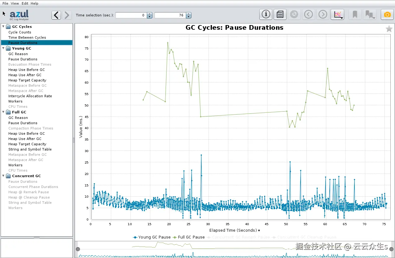 当我们使用 Zulu(OpenJDK 的一个版本)生成 GC 日志时,我们在日志文件中获得与大多数其他发行版相同的数据。以下图表显示,垃圾收集器暂停持续时间保持在 80 毫秒以下,垃圾收集后堆利用率保持在旧一代的 1GB 左右(用于长期对象)和新一代的 2GB 左右(用于临时对象)。