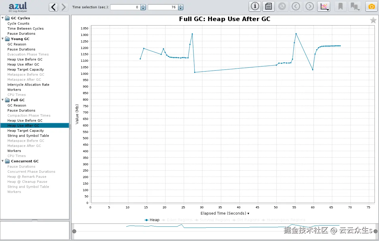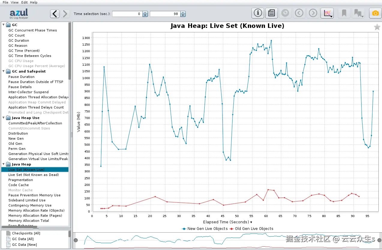 对于一般大小调整,Zing 的 Live Set 图表也很重要,因为它显示了活动对象的数量,例如,不包括未引用的对象,也称为垃圾。