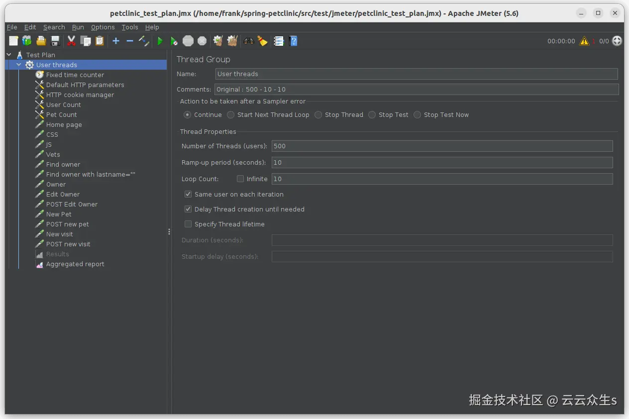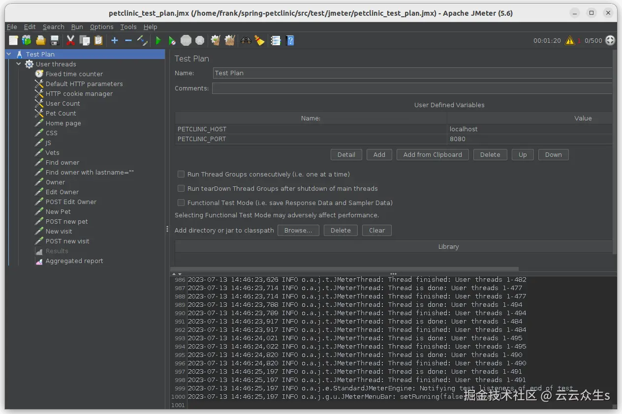 spring-petclinic/src/test/jmeter/petclinic_test_plan.jmx。 - 您可以通过点击开始按钮来执行测试以验证配置,这将启动线程来模拟 500 个用户。