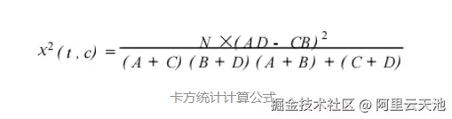 - 卡方统计:卡方统计体现特征词与类别之间独立性的缺乏程度,它同时考虑了特征词存在与不存在的情况。卡方统计值越大,独立性越小,相关性越大。计算公式如下: