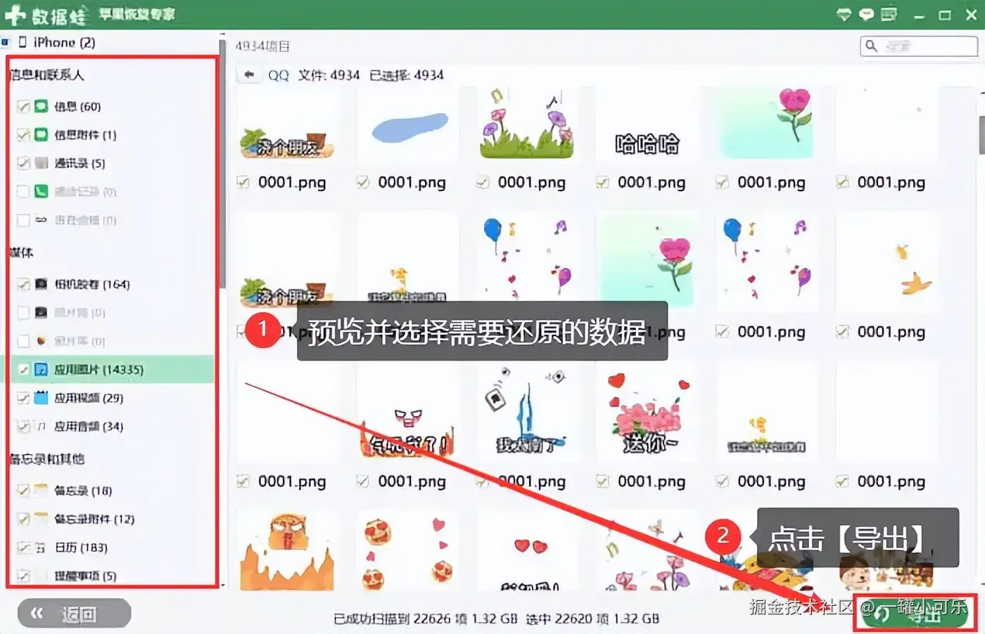 第3步:扫描完成后,预览并选择你想要恢复的数据。你可以预览照片、查看消息内容等。确认你的选择后,点击 【导出】 选项,开始数据恢复过程。等待数据恢复完成。恢复成功后,你可以在电脑或手机上查看到所恢复的数据。