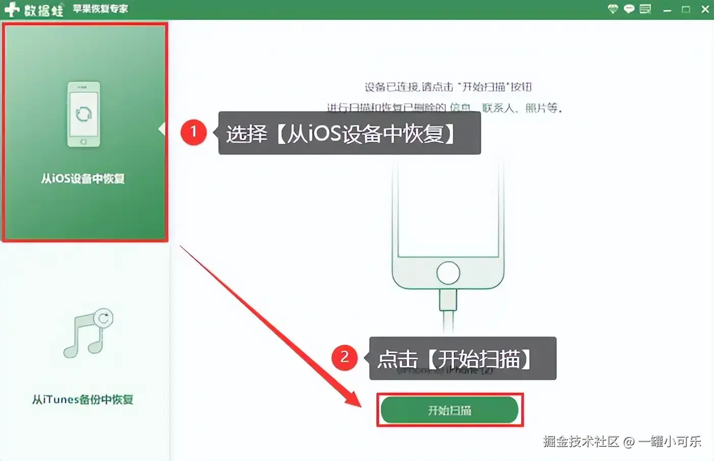 第2步:打开软件,选择 【从iOS设备恢复】 模式。软件会自动检测你的苹果手机,然后点击 【开始扫描】 。