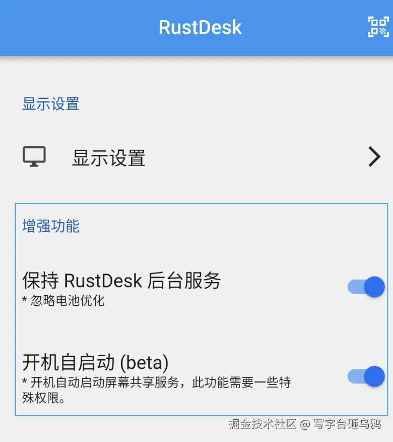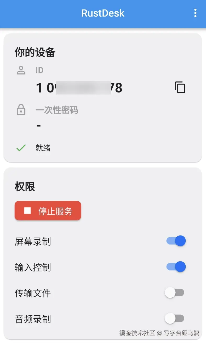 之后,就可以发现。RustDesk已经启动,并且在RustDesk内额外生成了一些文件