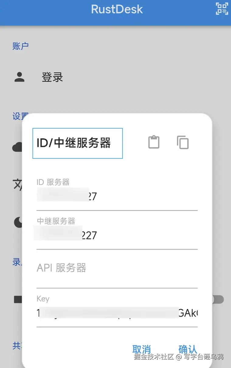 ID和中继服务器都是填写的服务器的ip地址,Key则填写的是上一步获取的公钥。
