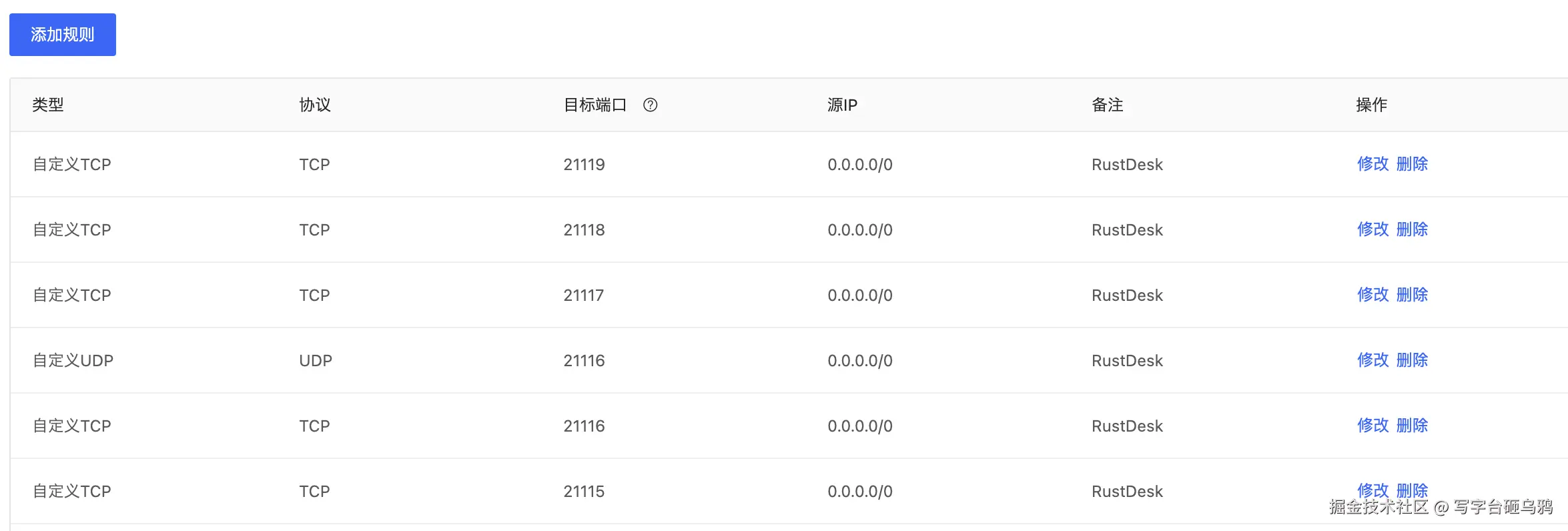 默认情况下,hbbs 监听21115(tcp), 21116(tcp/udp), 21118(tcp),hbbr 监听21117(tcp), 21119(tcp)。务必在防火墙开启这几个端口, 请注意21116同时要开启TCP和UDP。其中21115是hbbs用作NAT类型测试,21116/UDP是hbbs用作ID注册与心跳服务,21116/TCP是hbbs用作TCP打洞与连接服务,21117是hbbr用作中继服务, 21118和21119是为了支持网页客户端。如果您不需要网页客户端(21118,21119)支持,对应端口可以不开。