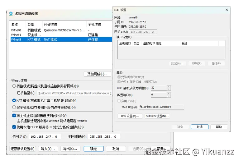 ①设置 VMnet8 虚拟网络的子网、掩码、网关