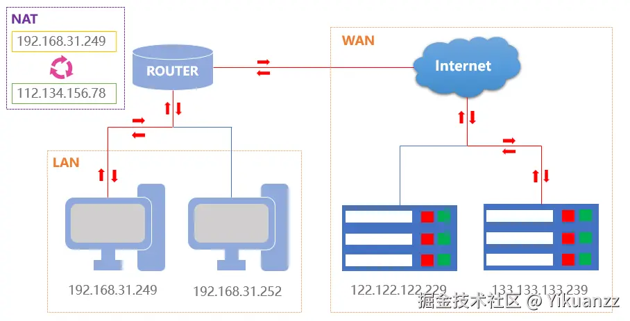 网络地址转换(NAT,Network Address Translation):是一种将私有 IP 地址转换为公共 IP 地址的技术,它允许多个设备共享一个公共 IP 地址,从而节省 IP 地址资源。