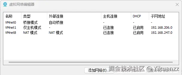 在编辑->虚拟网络编辑器中,我们一般会有三个虚拟网络分别是 VMnet0、VMnet1 和 VMnet8,分别负责进行不同的连接模式,并且在启用了 DHCP 功能的时候,虚拟机地址是动态分配的。
