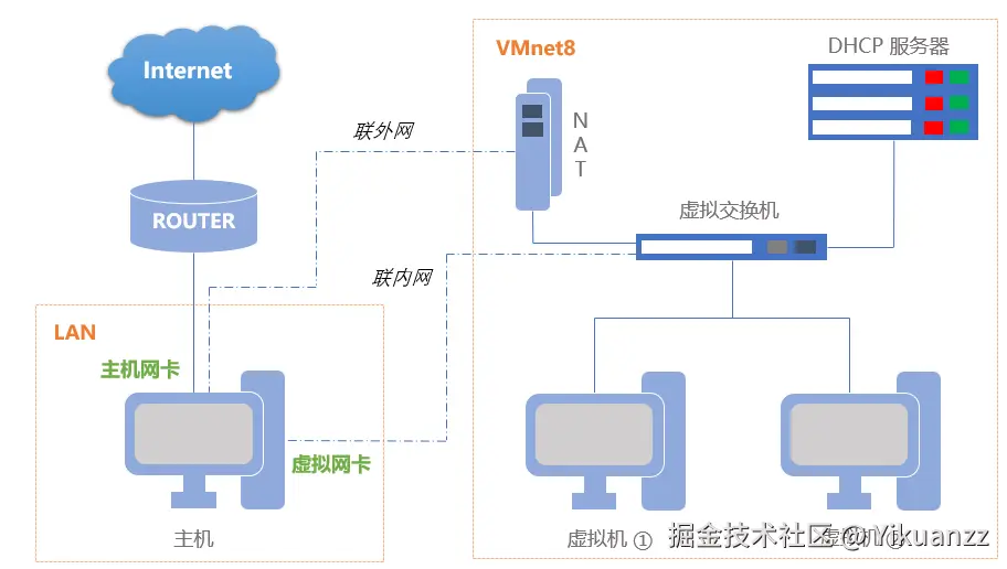 - 定义:NAT 模式通过主机的网络连接来访问外部网络,同时用虚拟网卡实现主机网络与虚拟机网络通信。虚拟机通过 NAT 设备和 DHCP 服务器获取 IP 地址,并通过主机的 IP 地址访问外部网络。