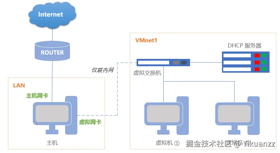 - 定义:主机模式将虚拟机与主机隔离开来,只允许虚拟机与主机之间通信。虚拟机通过虚拟网卡和虚拟交换机与主机通信。