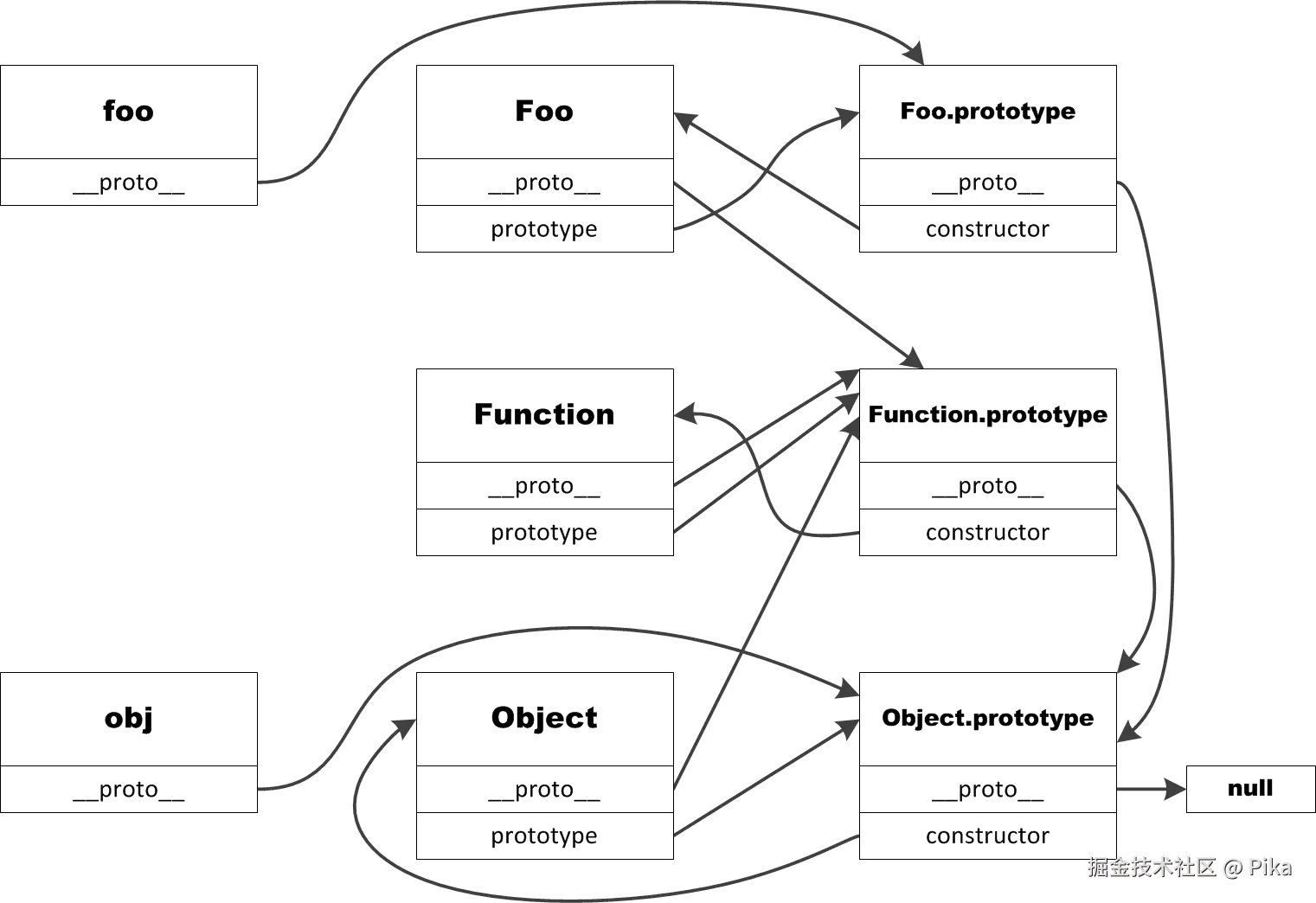 值得一提,proto => prototype 这个关系,会一直往上推,直到Function这个类,Function的__proto__会等于prototype,即它们是同一个东西,而一个对象最终的__proto__ 其实就等于Object.prototype,而Object.proto 等于Function.prototype,即以下代码都为true