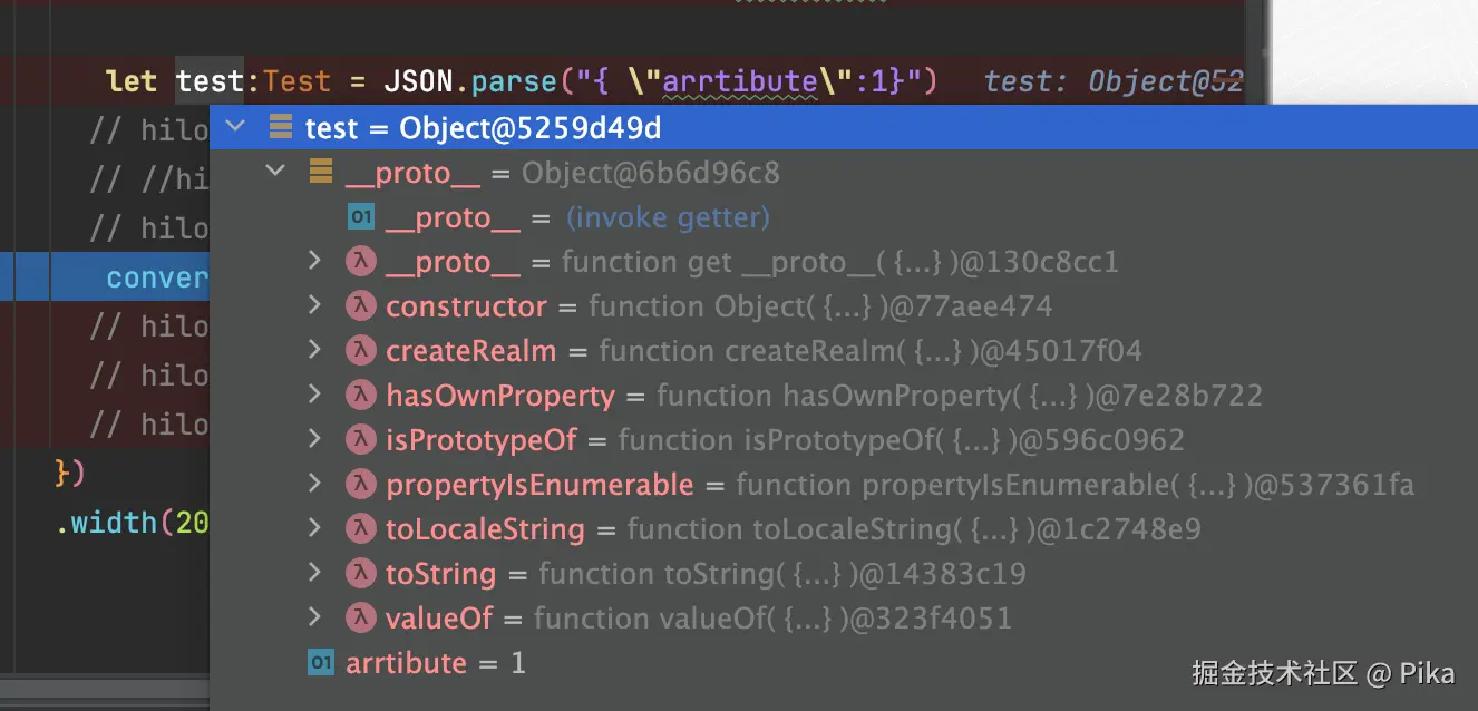 相信这个对于很多习惯了java/kotlin的开发者来说,肯定是一个坑。当然,这个并不是arkts的锅,而是动态语言typescript与js的特性。即便你有了一个声明了类的实例,它本身已经有可能不是“合格的”对象,我们拿一个例子来说: