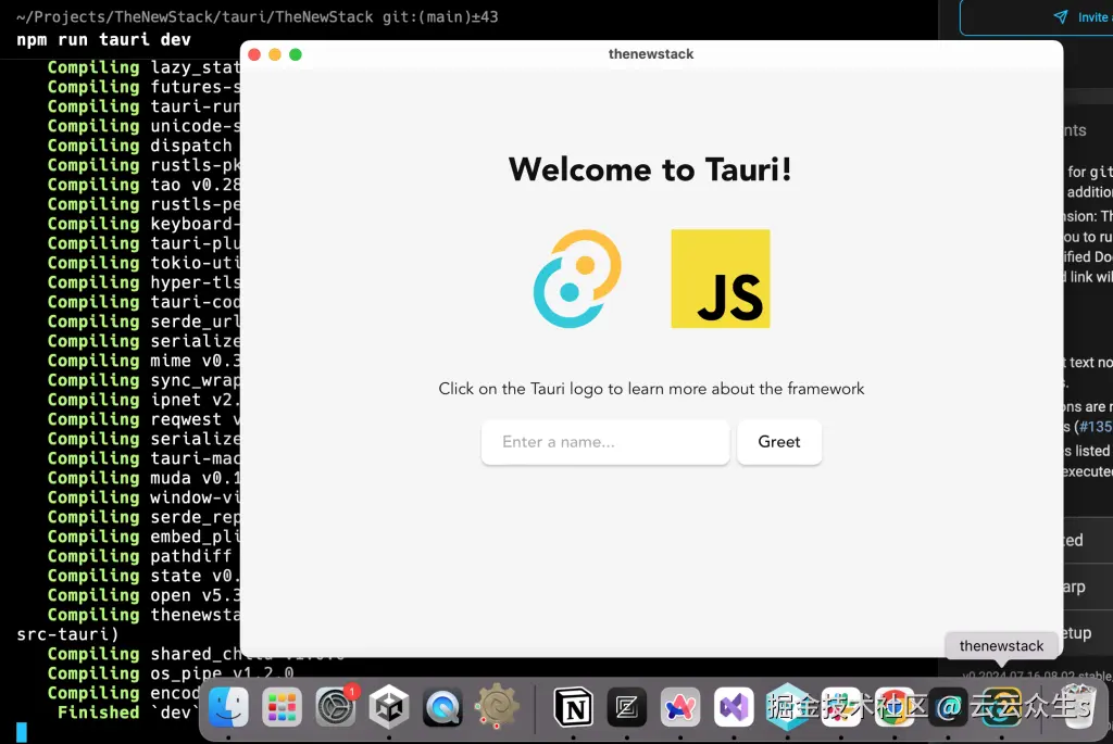 这将构建我们开始所需的所有包,第一次需要几分钟。这些将是 Rust 与您的操作系统窗口通信的方式。最终,它将启动应用程序: