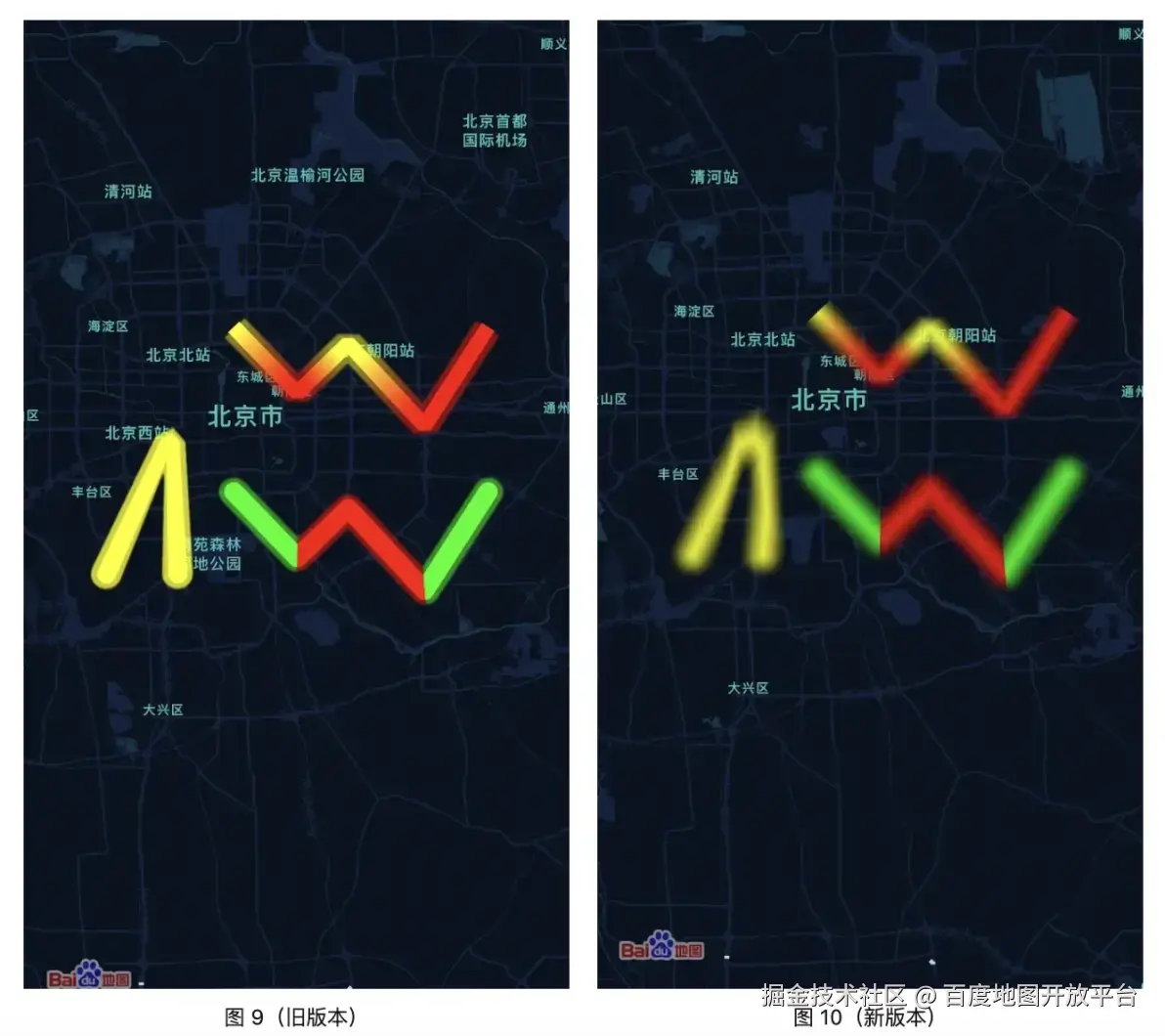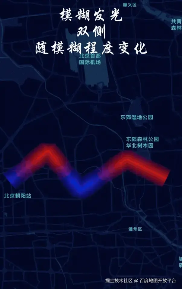 通过记录方向向量的方案,发光效果拥有了更多的自由度:新版SDK的发光效果不仅可以实现正常的向两侧发光,还支持单侧发光和向上发光。Polygon边线、Circle的边线、弧线、大地曲线也采用了类似Polyline的处理技术。