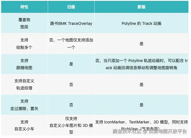 在新版 SDK 中,Polyline 新增的 Track 动画能力,可以根据行程进度对路线进行动画处理;除了按进度进行动画,还内置了绑路逻辑,开发者可以直接传入小车行进的位置和方向信息,由 SDK 自动绑路后进行动画;另外除了正常(Nomal)样式,还新增了走过和未走过路线样式,实现 Polyline 走过和未走过路线的自定义绘制。对比旧版的 BMKTraceOverlay,在性能、效果、易用性和灵活性方面都有较大提升。