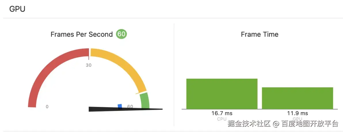 同等 26,050 个点数据路线绘制(乌鲁木齐-深圳),新旧版本性能对比,可以看到 CPU 占用率下降超 50%,GPU 性能没有明显改变。