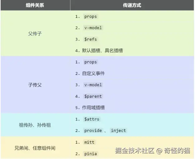 props父传子,子传父自定义事件子传父mitt任意组件通信v-model父传子,子传父$attrs父传子,父传孙,祖孙通信$refs父传子$pare子传父provide、inject祖传通信pinia任意组件通信slot父传子,子传父