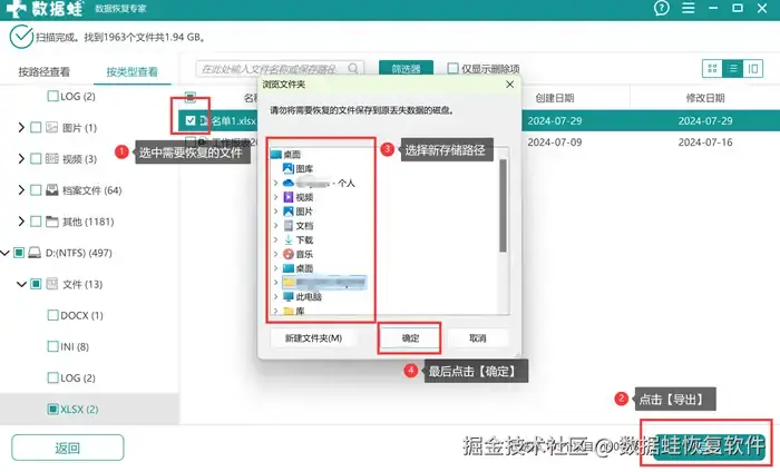 第3步: 选择好需要恢复的文件后,点击右下角的【导出】。在弹出的窗口中选择恢复文件的新存储位置,最后点击【确定】即可。