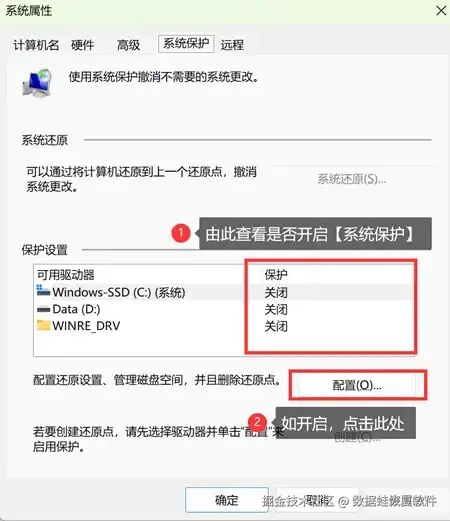 步骤2: 在该页面,您可以查看到该电脑在误删之前是否开启好了系统保护设置,如显示已开启,则可以进行下一步操作:点击【配置】,进入新的页面把电脑的数据状态设置到文件误删之前的时间点即可。