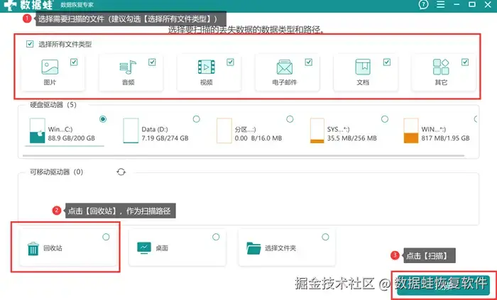 在这里我想向您推荐数据 蛙恢复专家,它的页面设计简洁清晰,即使您没学过电脑相关的知识,是一个零基础电脑小白,也可以轻松操作,恢复电脑回收站已删除东西。该软件还能支持扫描和恢复大部分文件类型,精准定位用户需要恢复的目标文件。