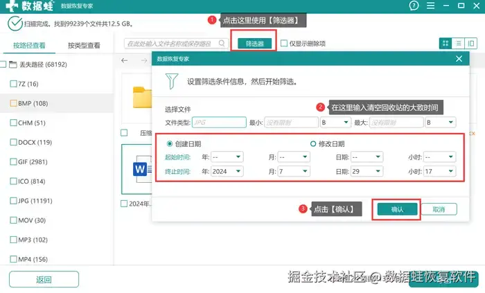 第2步: 出现扫描结果后,您可以选择使用【筛选器】功能,根据点击【清空回收站】的时间(即修改时间)缩小需要寻找的文件范围。