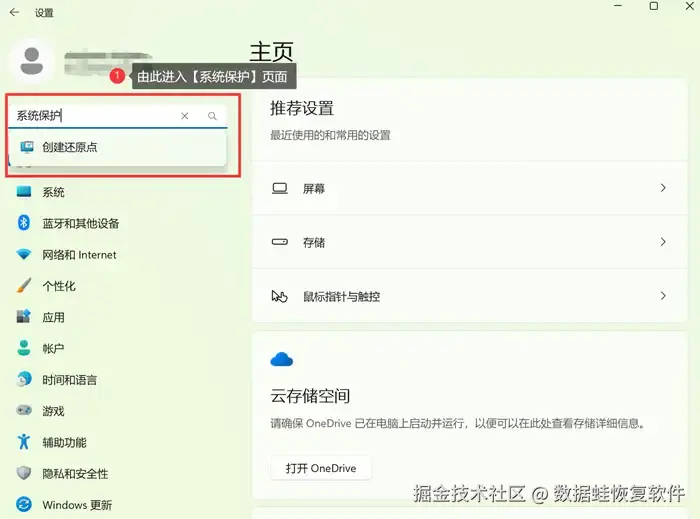 步骤1: 打开【设置】,点击【创建还原点】进入【系统保护】页面(如果找不到,可以直接在设置的搜索框内查找【系统保护】等关键词)。