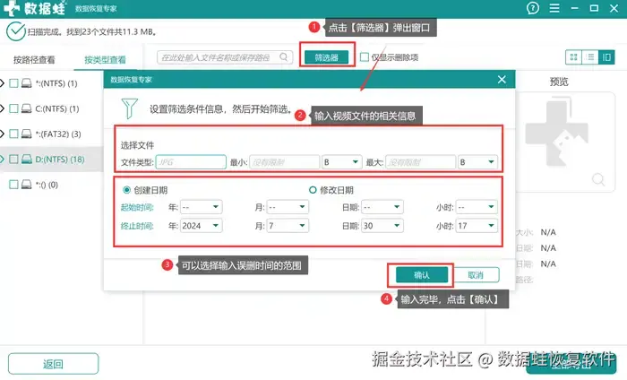 步骤3: 扫描结果出来后,你可以根据自己需要寻找的目标视频的类型去选择查看。(这里提供路径和文件类型两个途径查看)如果需要更加高效,建议选择【筛选器】工具,通过选择误删即修改视频文件的时间,输入限定范围后搜寻目标视频。