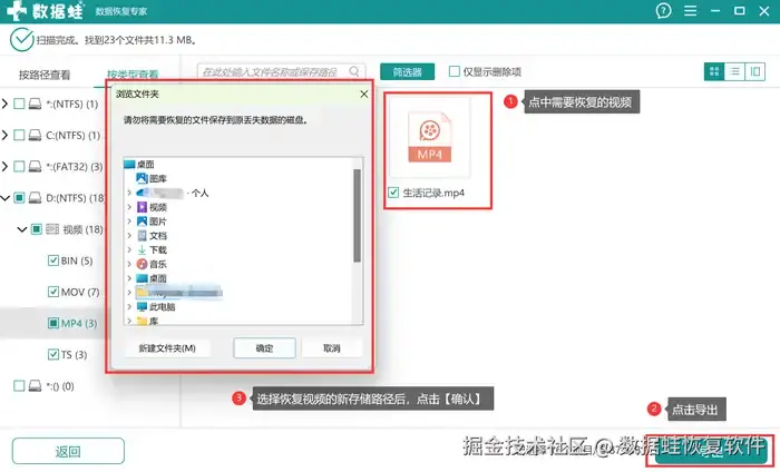 注意:不要将恢复好的视频文件放回原来的磁盘路径里。