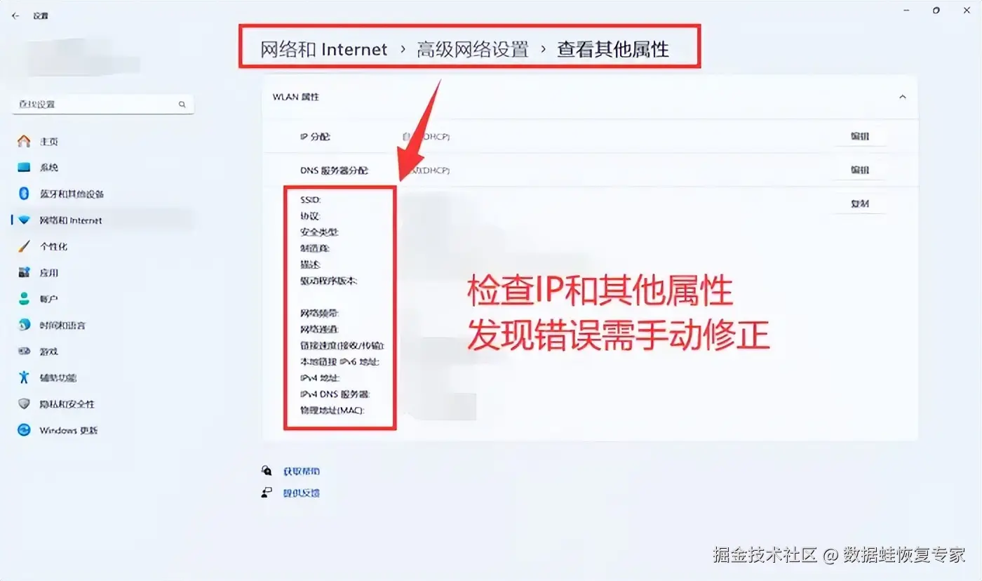 如果以上步骤都没有解决问题,可能是IP地址配置出现了问题。你可以进入电脑设置,在 【网络和Internet】 的 【高级网络设置】 中查看网络属性,检查IP地址是否正确。如果发现异常,那么可能需要手动设置或重置这些参数。设置完成后,再重启电脑和路由器,再重新连接网络。