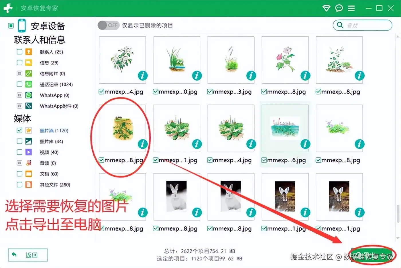 第三步:选择好要恢复的照片后,点击 【导出】 按钮,它会将这些照片保存到电脑上指定的文件夹中。