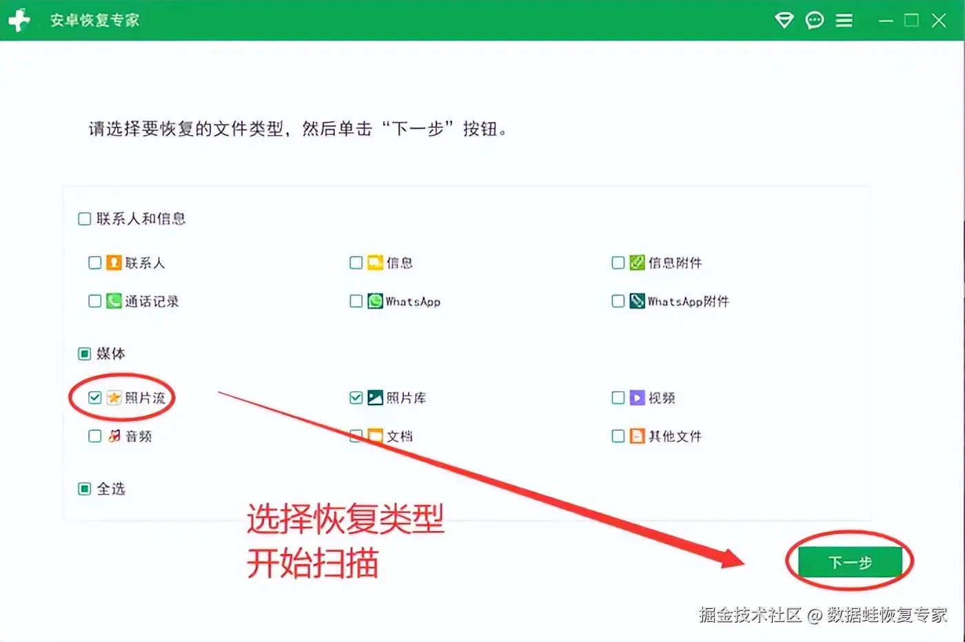 第二步:在软件界面中,选择你希望恢复的文件类型。由于我们的目标是找回照片,因此请确保勾选 【照片流】 或 【照片库】 选项。