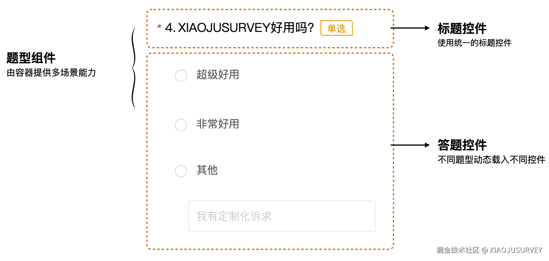 一个题目结构的组成如下,不同场景能力基于容器实现,不同题型差异一般在于答题区域,通过答题控件实现: