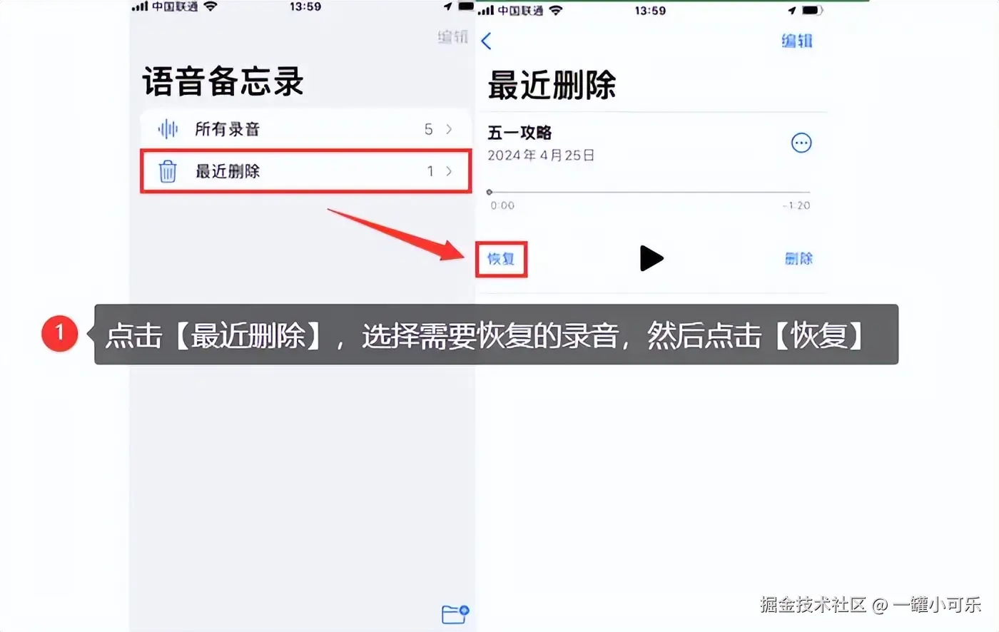 步骤2:进入 【最近删除】 后,找到你想要恢复的录音。点击 【恢复】 按钮,系统将会把录音从 【最近删除】 中恢复到原来的位置。