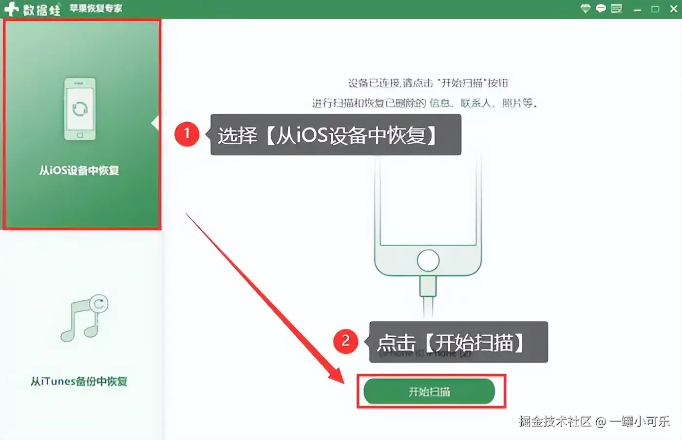 步骤2:运行软件后,选择 【从iOS设备恢复】 模式,并点击 【开始扫描】 按钮。软件将开始扫描你的iPhone,寻找可以恢复的数据。