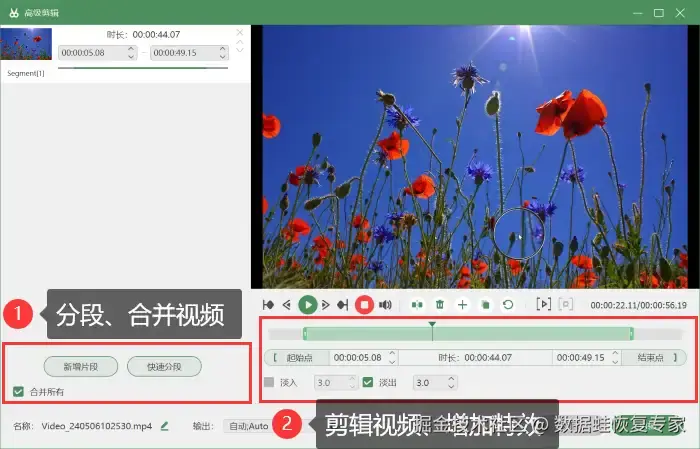 第四步:录制完成之后,预览视频或者进入 【高级剪辑】 页面,可以剪辑视频、给视频添加特效、还可以对视频进行快速分段,接着通过点击 【剪辑】 按钮结束此次录制。